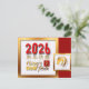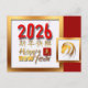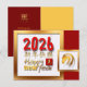 Gran cuadrado enmarcado en colores dorados con gran rojo 2026 + saludo en chino e inglés + pequeño ideograma chino para caballo y una pequeña plaza enmarcada en colores dorados para un dibujo original dorado. Diseño en postales de vacaciones con textos al personalizar en la parte posterior de la tarjeta. Puede cambiar fácilmente los textos haciendo clic en el botón personalizar. Perfecto para el Año Nuevo Chino del caballo 2026.