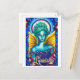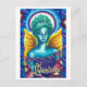 Una postal de arte único, perfecta para hacer de sus saludos una de las más amables! El diseño postal de un hada azul y verde vívida con alas doradas y halo brillante hace de esta una gran carta para los aficionados a la fantasía. La postal está en blanco en la parte de atrás, con el pequeño logo de Zazzle y el logo del artista en la parte inferior.