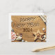 En esta postal de Año Nuevo se muestra una impresionante imagen de la playa con conchas. ¡También puedes cambiar el año! En la parte delantera de la postal se lee: "Feliz Año Nuevo 2024" y en la parte trasera de la tarjeta postal, "Que tu Año Nuevo esté tan lleno de bendiciones como la playa tiene casetas de mar". ¡Una dulce postal para enviar a familiares y amigos para el Año Nuevo!