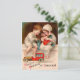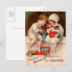 Esta es una dulce postal vintage de Navidad de un lindo niño y chica jugando con sus regalos de Navidades. El niño está admirando un reloj de bolsillo de sus Navidades cargando mientras un auto de juguete rojo está en el suelo a sus pies. La niña está sosteniendo su muñeca, con un vestido rojo, cerca de ella. La tarjeta postal dice: "Saludos cordiales para los Navidades".