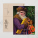 Esta tarjeta es una de una serie que muestra al alegre compañero entregando regalos y Navidades vitoreando. Su elegante gorra y bata están decorados con piel y trenzas. La imagen original presenta colores ricos y elegantes y es un diseño perfecto para la correspondencia de vacaciones y los elementos decorativos. En consonancia con el estilo antiguo, el reverso de la postal presenta también un diseño decimonónico.