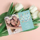 Comparte saludos de primavera esta Pascua con nuestra tarjeta de fotos dulce y caprichosa, que incluye tu foto favorita junto con "Pascua feliz" en letras escritas a mano adornadas con flores y mariposas. Añade tus nombres debajo de blanco sobre un fondo turquesa claro.