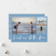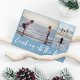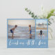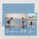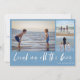 Collage de fotos de familia tres "Riéndose hasta el final" Navidades de playa azul tarjeta de vacaciones. Personalizado con tres de tus fotos favoritas, saludo y apellido.
