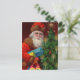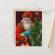 Este elegante Santa, vestido de rojo tradicional, entrega regalos a los Navidades y un árbol iluminado con velas. Es una hermosa imagen para la decoración y la correspondencia de las vacaciones. Santa les desea a todos una Feliz Navidad con letras doradas mientras una brillante estrella de Navidades reluce en el fondo.