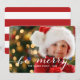 El tipo de letra del guión grabado a mano hace de ésta la tarjeta de foto perfecta para las vacaciones y enviar sus saludos de Navidad a sus amigos y familia usando esta maravilla. "sé alegre" superposición de texto blanco. Diseño de ELKE CLARKE© PARA MONOGRAM GALLERY. Reemplace la foto de ejemplo con la suya propia. Fondo rayado rojo y blanco en la parte posterior de la tarjeta. Otros colores disponibles en la tienda.