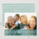 Una simple y moda tarjeta fotográfica navideña presenta su foto familiar favorita con una abigarrada banda verde a lo largo de la parte inferior. "Feliz Navidad" aparece en letras blancas modernas de caligrafía con tu nombre o nombres de familia y el año en la parte inferior derecha. Las tarjetas se revertirán a un patrón de rayas variadas en verde salvia pálido.