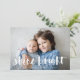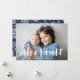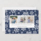La tarjeta de fotografía festiva Hanukkah muestra su foto horizontal o orientada al paisaje favorita en todo el sangrado, con "brillo brillante" colocado en la tipografía de pincel con letras blancas. Personalice la parte delantera de la tarjeta con sus nombres y mensajes breves de vacaciones, y agregue tres fotos adicionales a la parte posterior en un diseño de collage en un fondo con motivos de copo de nieve azul marino, junto con un mensaje personal personalizado. Para una parte posterior en blanco, simplemente elimine las plantillas de fotos y la capa mate blanca.