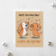 Esta tarjeta de cumpleaños incluye dos adorables perros 2D bailando sobre un fondo de color pergamino con notas de música negra. Los perros están sonriendo y pasándola bien, y el texto de arriba dice "¡Sigue bailando!" mientras que el de abajo dice "¡Feliz cumpleaños!" Es una carta divertida y colorida, perfecta para quien quiera bailar.
