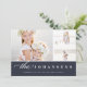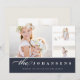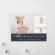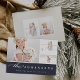 La tarjeta fotográfica de vacaciones, sencilla y elegante, incluye tres fotos en un diseño de collage, con el nombre de tu familia y el mensaje personalizado debajo de un blanco crujiente sobre un fondo azul marino rico. Añade dos fotos adicionales a la parte posterior, junto con texto personalizado opcional adicional, sobre el marfil cálido que contrasta. Una hermosa elección minimalista que hará que sus envíos de correo de vacaciones destaquen del paquete.
