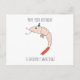Esta postal está impresa con un diseño hecho a mano que presenta un camarón lindo y naranja en un gorra de cumpleaños y el mensaje de juego de palabras "Espero que tu cumpleaños sea tremendamente asombroso". El interior se deja intencionalmente en blanco para permitir un mensaje personalizado.
