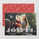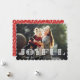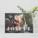 La tarjeta festiva y alegre de la foto del día de fiesta ofrece su horizontal preferido o ajardina la imagen orientada con "alegre" sobrepuesta en las letras blancas del estilo del picado del papel. Personalice con su navidad de encargo que saluda debajo. Las tarjetas invierten a un modelo botánico hivernal en blanco en rojo. Sugerimos el estilo de papel formado concha de peregrino para complementar la mirada del recorte de las letras "alegres".