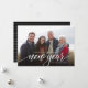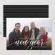 Esta tarjeta moderna de la foto del día de fiesta del Año Nuevo ofrece las palabras "Año Nuevo" en una escritura blanca. Su foto se exhibe detrás. La parte posterior es un modelo rayado blanco y negro.