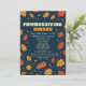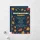 Reúne a tus amigos para una divertida cena de fiesta con esta elegante y moderna invitación de cena de Acción de Gracias entre amigos. El diseño presenta hojas naranjas y amarillas que caen contra un fondo azul oscuro contrastante. Esta tarjeta es totalmente personalizable con tu dirección, detalles de RSVP y una nota especial sobre traer un plato para una cena compartida.