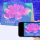 Una deliciosa flor de dahlia enmarcada en sorprendentes tonos azules. Gracias, en rosa bonito, está debajo de la flor.