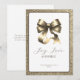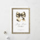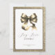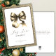 Tarjeta de felicitación de alegría navideña moderna con un lujoso lazo dorado en el centro, enmarcado por un borde dorado brillante. La tipografía moderna es de color negro suave que complementa el dorado, combinada con el mensaje "Alegría, Amor y Brillo" que captura el espíritu de la temporada de una manera elegante y sofisticada. Fácilmente personalizable con tus datos personales. Perfecta para enviar a amigos, familiares o colegas.