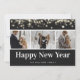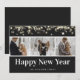 Collage de fotos en negro moderno tarjeta Happy New Year con un alegre tipo de letra de guión y un collage de fotos en un fondo negro adornado con brillantes luces y estrellas.