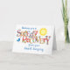 Una tarjeta de saludo brillante y alegre para desear una pronta recuperación a todo aquel que haya tenido cirugía cardiaca. Las grandes palabras, "Rápida Recuperación", están llenas de coloridos motivos de frutas estivales y de estribos a juego. Un gran sol, un pequeño pájaro azul y una flor azul dan un aspecto positivo. El saludo de portada es, 'Deseándote una Rápida Recuperación de tu Cirugía del Corazón', con la mayoría de las palabras en escritura azul informal. El mensaje interno se puede personalizar o borrar fácilmente