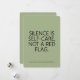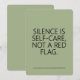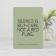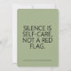 Habla mucho sin decir una palabra. Esta carta audaz muestra el mensaje fortalecedor: "EL SILENCIO ES AUTOCUIDADO, NO UNA BANDERA ROJA." - un regalo reflexivo para los introvertidos, los defensores de la salud mental o cualquiera que honre la fuerza silenciosa. Tarjeta de salud mental, tarjeta de autocuidado, tarjeta de introvertido, tarjeta de empoderamiento, cita de silencio, fuerza tranquila, tarjeta de presupuesto inspirador, tarjeta de afirmación de personalizado, wellness mental, bienestar emocional, papel feminista, tarjeta de mensaje en negrita, regalo de terapia, tarjetas de zazzle, tarjeta de apoyo, regalo de autoamor, tarjeta mental, regalo de empoderamiento, tarjeta única tarjeta de aliento