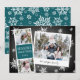 La tarjeta de fotos Cute Holiday cuenta con una tira de fotos con dos fotos y un panel de texto que dice "Greetings's Season" (Saludos de temporada), además de una instantánea inspirada en la cámara con un pie de foto escrito a mano. Personalice el nombre de su familia en un entorno rústico de pizarra con copas de nieve blancas dibujadas a mano.