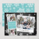 La tarjeta de fotos Cute Holiday incluye una tira de cabina de fotos con dos fotos y un panel de texto turquesa helado, además de una instantánea inspirada en la cámara con un pie de foto escrito a mano. Personalice con el año y su nombre de familia o mensaje personalizado, en un entorno rústico de pizarra con copos de nieve blancos dibujados a mano.