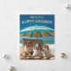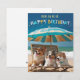 Esta bonita tarjeta contiene tres cadáveres fotorealistas sentados en una silla de playa de madera bajo un paraguas azul. El texto dice "De todos nosotros... FELIZ CUMPLEAÑOS". Perfecto para los amantes del perro o para cualquiera que quiera mandar deseos de cumpleaños de un grupo.