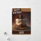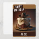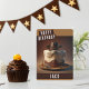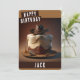 Una tarjeta de cumpleaños con un pastel de cumpleaños con tema de vaquero en la parte delantera con "Feliz Cumpleaños", letra en negrita con mayúsculas. Personalice la parte delantera agregando su(s) nombre(s). El interior de la tarjeta incluye espacio para el mensaje escrito a mano o con tipeo.