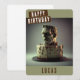 Una tarjeta de cumpleaños espeluznante con una torta de cumpleaños temática Frankenstein en la parte delantera con "Cumpleaños feliz", letra negrita con mayúsculas. Personalice la parte delantera agregando su(s) nombre(s). El interior de la tarjeta incluye espacio para el mensaje escrito a mano o con tipeo.
