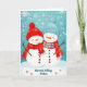 Una encantadora ilustración que presenta a dos alegres muñecos de nieve acurrucados juntos, usando sombreros de punto rojos y azules y bufandas de cuadros. Están en una escena nevada bajo un cielo azul claro lleno de copos de nieve de invierno. La tarjeta transmite "Deseos de vacaciones más cálidos", lo que la hace ideal para difundir la alegría navideña y invernal a los seres queridos.