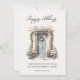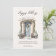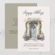 Tarjeta de Felices Fiestas Empresariales con guión moderno "Felices Fiestas" con imagen de puerta principal decorada con vegetación festiva de acuarela y espacio adicional en la parte posterior para mensaje personal plano.