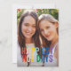 Esta divertida tarjeta de fotos navideñas presenta tipografía de arcoíris sobre una foto vertical de sangrado completo. El saludo en la parte delantera dice "Felices Fiestas". Este diseño acomoda una sola foto vertical en la parte delantera de la tarjeta. En el reverso encontrará un festivo patrón de franjas diagonales rojas y blancas que se pueden eliminar o personalizar. También puede agregar otra foto o texto en la parte posterior seleccionando "personalizar diseño aún más".