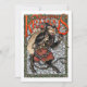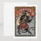 Tarjeta de vacaciones con Krampus, llevando un saco de niños traviesos a su guarida, con cadena y vara para azotar.