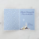 Escena vintage de una iglesia y campanario cubierto de nieve en una noche de luna con ramas brillantes en primer plano reimpreso en esta tarjeta de saludo.