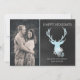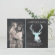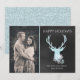 Elegante, rústico, plano, tarjeta de felicitación de vacaciones hecha con un estilo de pizarra gris de carbón, a la derecha, y una foto personalizado en el lado izquierdo. Gráficos de una cabeza de ciervo aguamarina, con unos cantos de purpurina acuático, decoran el lado de pizarra de la tarjeta. En el fondo del ciervo hay copos de nieve de color blanco y aguamarina. Personalice los campos de texto en blanco para adaptarlos a las necesidades de la tarjeta de Navidades.