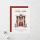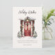 Tarjeta de felicitación plana de "Deseos Navideños" con guión moderno, imagen de puerta principal decorada con vegetación navideña y espacio adicional en la parte posterior para mensaje personal.