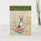 Envíe esta tarjeta a sus seres queridos para celebrar el regreso de la primavera. Cuenta con un conejito blanco y negro, huevos coloridos, sauces y crocses.