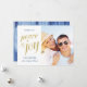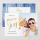 Añade tu propia foto y saludo personalizado a esta tarjeta de vacaciones costeras. Presenta las palabras "Paz y Alegría" en un falso color dorado. En la parte trasera hay dos estrellas de mar de un color dorado falso. El fondo es de madera azul turquesa, con un espacio blanco que te da la bienvenida. Para ver más de mis mejores tarjetas de felicitación de Navidades de vacaciones y ofertas de tarjetas de vacaciones visitar www.zazzle.com/vginvites