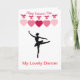 Una tarjeta de felicitación del el día de San Valentín que ofrece gráficos de "mi bailarín precioso" con corazones rosados y un bailarín hermoso en el frente.