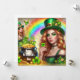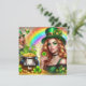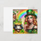 Tarjeta de vacaciones del Día de San Patricio con mujeres duendes, tréboles, olla de oro, monedas de oro y un arcoíris