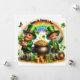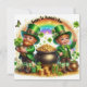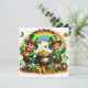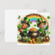 Tarjeta de vacaciones de Feliz Día de San Patricio con duendes, tréboles, ollas de oro, flores, tréboles, mariposas y un arcoíris