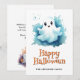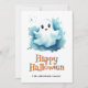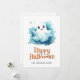 Tarjeta de Feliz Halloween con una ilustración de acuarela de fantasmas y calabazas. Personalice fácilmente esta tarjeta de Halloween para niños con el nombre de su familia y texto.