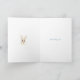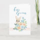 Aquí hay un dulce diseño de Pascua compuesto por colores pastel suaves. Hay un ramo primaveral de flores azules y melocotón, con acentos verdes. Escondido entre las flores hay un conejo marrón. En el interior, hay un área para que agregues tu mensaje o puedes quitar el cuadro de texto y escribir una nota a mano.