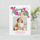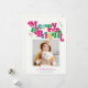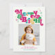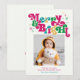 Estas tarjetas retro de vacaciones de 5" x 7" muestran el saludo alegre y colorido "Merry & Bright", en magenta, verde, azul y oro y un saludo editable, "Te deseo paz, amor y alegría esta temporada navideña", con un marcador de posición para tu foto favorita, y tu(s) apellido(s).