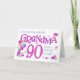Una tarjeta de cumpleaños número 90 para tu abuela, muy bonito, con la palabra "abuela" llena de patrones florales rosas y malvas y el número 90 lleno de puntos de polka coincidentes. El saludo de portada es: "¡A los más maravillosos GRANDMA 90 años jóvenes de hoy!" con racimos de flores de los patrones que lo dibujan todos juntos. El mensaje interno es: '¡Que tengas un cumpleaños maravilloso!' pero esto es solo una sugerencia y puedes cambiarlo fácilmente a lo que quieras.