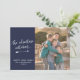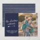 ¡Una divertida tarjeta de fotos de Año Nuevo perfecta si se te escapa el bote de tarjetas de Navidades! Este diseño presenta la frase 'la aventura continúa' en una letra con estilo de escritura con letras blancas subrayada con una flecha blanca dibujada a mano, y su saludo personalizado debajo. A la derecha, coloca tu foto familiar favorita. La parte posterior de la tarjeta presenta un patrón de franjas blancas, y el color de fondo general de la tarjeta es azul marino.