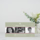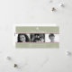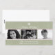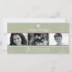 Muestre a su familia con tres fotos contra un hermoso fondo estacional de copos de nieve acentuado por reglas rojas. Su mensaje de vacaciones personalizado se destaca en blanco contra el fondo verde salvia coronado por un solo copo de nieve blanco. Disponible en colores alternativos con productos coincidentes.