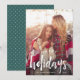 Comparte saludos de vacaciones con estas tarjetas de Navidad que presentan tu foto vertical u orientada al retrato favorita. "Felices Fiestas" aparece en la parte inferior como una superposición de texto en tipografía de letra a pincel blanca. Personaliza con el nombre de tu familia o nombres debajo. Las tarjetas se revierten a verde abeto con un patrón de puntos sutil blanco.