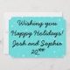 ¡Los juguetes han cobrado vida en esta tarjeta de fotos del desfile de juguetes de los Navidades retro! El diseño minimalista incluye una bailarina elegante y un petardo colorido sobre un escenario de grano de madera. Un árbol de Navidad verde con un diseño geométrico verde más brillante separa los dos juguetes. Detrás del juguetón dúo, podemos ver dos árboles de Navidad más —uno es verde con puntos de polka blanco y el otro tiene un patrón de chevron verde y blanco. El telón de fondo es turquesa con nieve azul claro cayendo. La bailarina lleva puesto un tutu rosado y zapatos de pies. Su pelo rubio está en un pan clásico. El poderoso petardo lleva una chaqueta roja y dorada con acentos negros y un cinturón negro ancho. ¡Incluso tiene un gorra impresionante para igualar! Sus pantalones reales azules están metidos en botas negras altas. (¡Cuanto mejor para marchar, querida!) ¡Los rostros de los dos están listos para tus fotos! ¡Así es! No necesitas una foto profesional, ni siquiera una foto con ambos temas juntos. Con este diseño deliciosamente caprichoso, puedes elegir la mejor foto de dos personas, reemplazar las fotos de la plantilla, y... ¡Voila! ¡Tienes una tarjeta de foto de vacaciones que encantará a tus amigos y familia! El lado opuesto de la tarjeta tiene un fondo turquesa con bolas de nieve azul claro. Personaliza tu mensaje especial de vacaciones. Este diseño es perfecto para los jóvenes, los jóvenes en el corazón y los simples y extravagantes. Fotografía © Storytree Studios, Stanford, CA