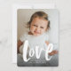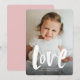Si perdiste la oportunidad de enviar tarjetas de vacaciones, ¡no te preocupes! Envíe amor y alegría con una foto del saludo de San Valentín. Esta tarjeta vertical contiene una foto en el frente junto con un cepillo moderno y audaz "amor" en blanco rodeado de especkles. Los especkles coincidentes saltan la parte posterior, que es un rosa dulce de forma predeterminada pero se puede cambiar haciendo clic en personalizar. En la parte delantera también hay un lugar para tres líneas de texto de personalizable donde puedes decir Feliz Día de San Valentín o lo que quieras.