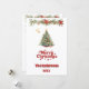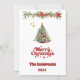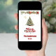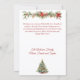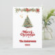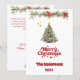Fondo blanco, texto rojo y foto en el frente. Decorado con un árbol de Navidad y un guirnalda de pino con flores rojas de poinsettia. Su texto y nombres en la parte posterior. Feliz Navidad se escribe con un tipo de letra de estilo retro.