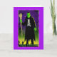 Esta tarjeta de Halloween presenta un personaje espeluznante pero juguetón en la parte frontal. El personaje parece ser una mezcla entre un monstruo clásico y un esqueleto, con una cara brillante verde parecida a una calavera y manos brillantes verdes. El personaje está vestido con un traje negro con un diseño de caja torácica esquelética en el pecho. Sostiene un palo de escoba en una mano, lo que añade un elemento de bruja al disfraz.